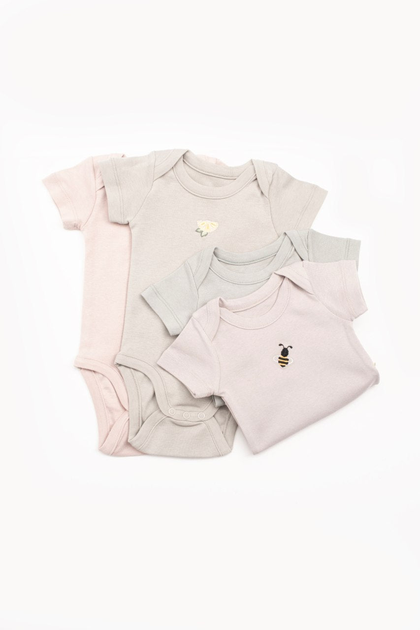 Sweet, simple, and super soft—this set of embroidered baby bodysuits is a must-have for everyday comfort. Made from organic cotton, each bodysuit is gentle on sensitive skin and features cute minimal embroidery like a bee or flower. The envelope neckline and snap buttons make dressing easy and quick.